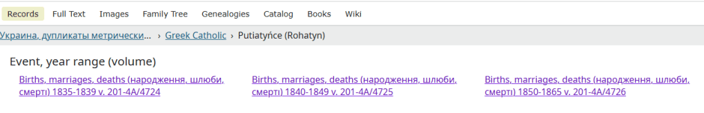4. Now you can begin searching through the births, marriages, and deaths of residents of Putyatyntsi from 1835-1865.